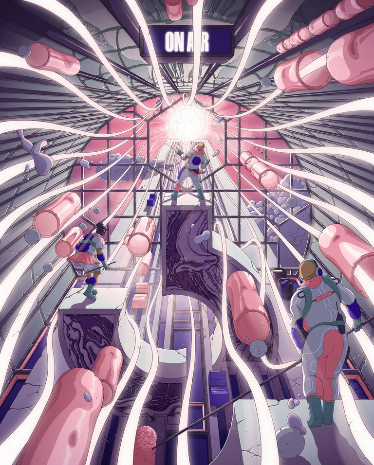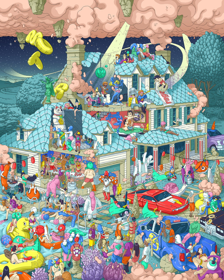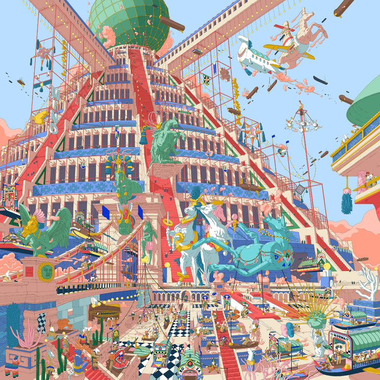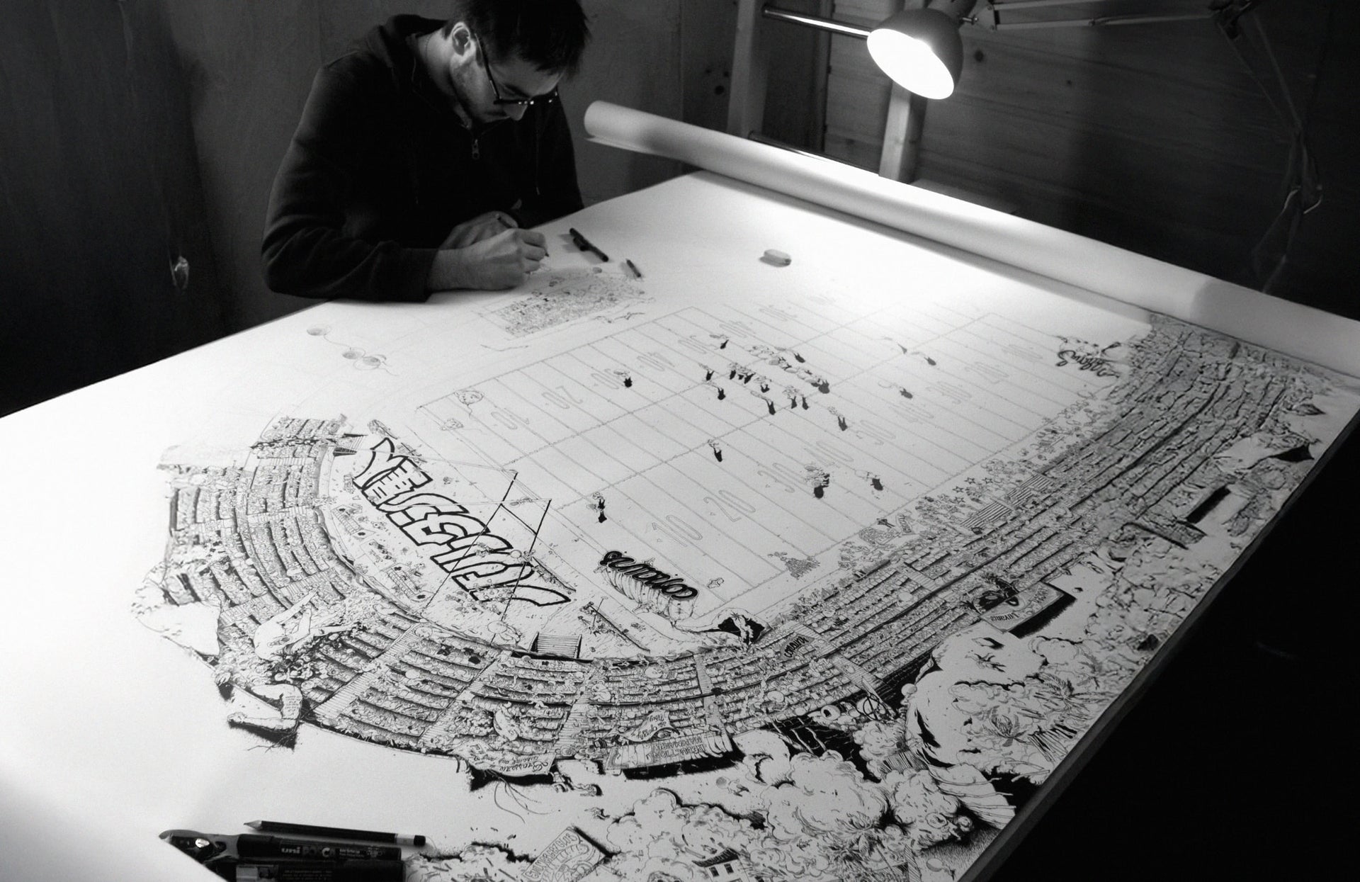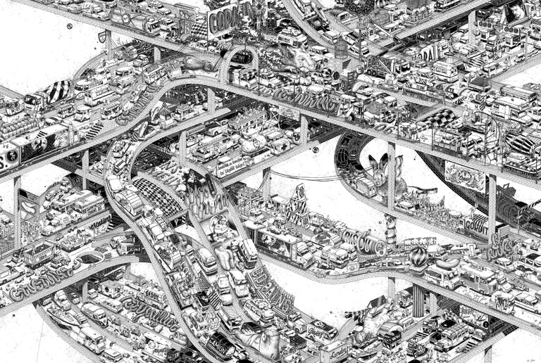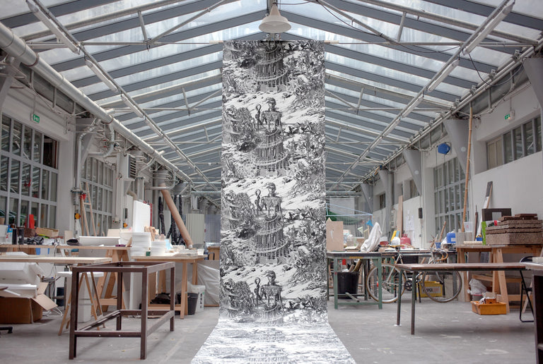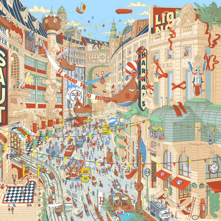 The work is exhibited and meets with immediate success. A second mural is immediately commissioned. Then collaborations follow with renowned houses and institutions, revealing in the process a unique style: an obsession with detail, teeming urban visions, mental architectures...